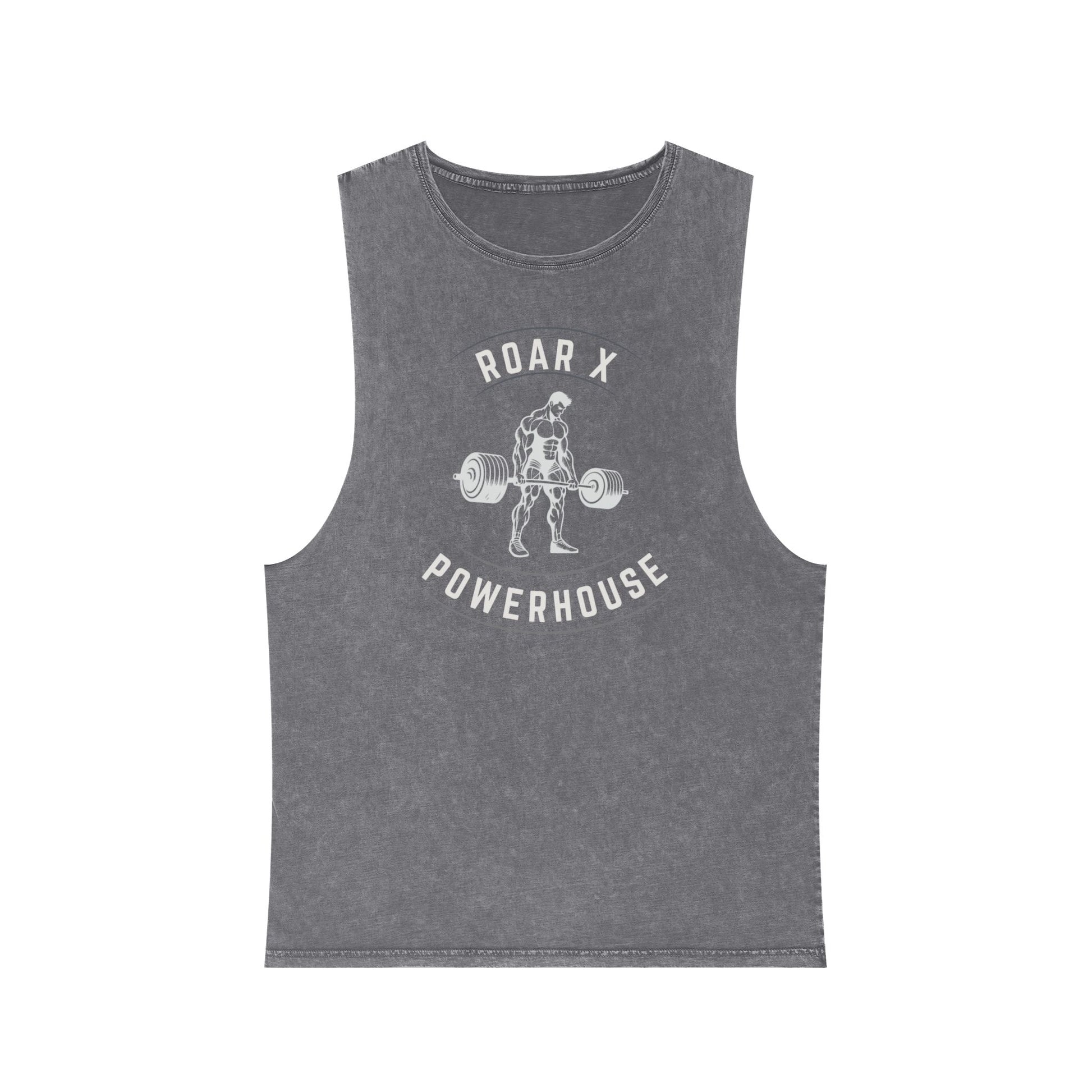 The RoarX POWERHOUSE Vest is a stone washed tank top with raw sleeve edges, a ribbed collar, and shoulder-to-shoulder tape for durability and style. Made from 100% pre-shrunk combed cotton, this extra light fabric tank top is perfect for active individuals looking for a comfortable and well-fitted tee. Ideal for casual wear and gym workouts, this tank top is a must-have for summer holidays, outdoor activities, and sports events.
